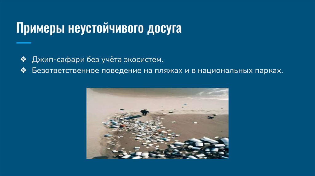 Примеры неустойчивого досуга❖ Джип-сафари без учёта экосистем.