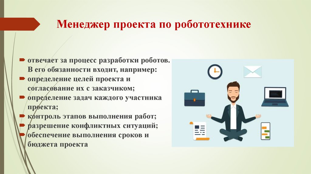 отвечает за процесс разработки роботов.В его обязанности входит, например: