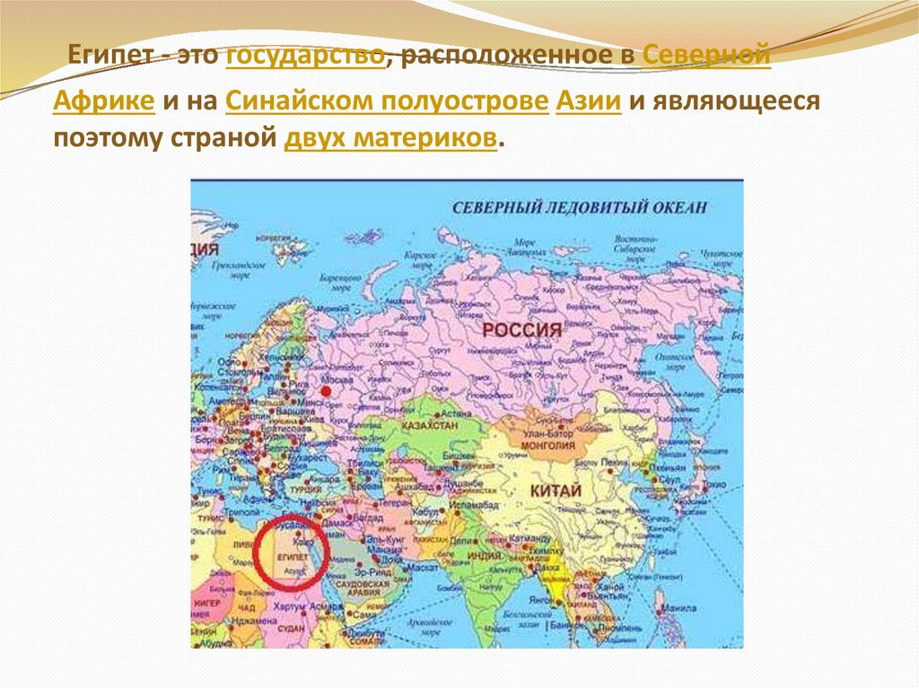 Египет - это государство, расположенное в СевернойАфрике и на Синайском полуострове Азии и являющееся