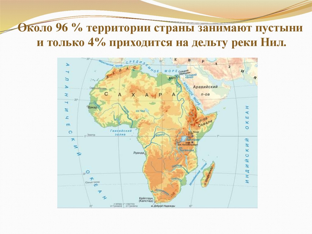 3. Около 96 % территории страны занимают пустыни и только 4% приходится на дельту реки Нил.