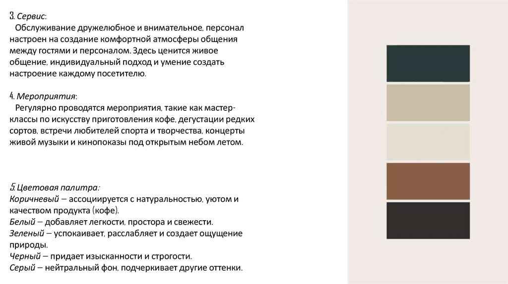 Регулярно проводятся мероприятия, такие как мастерклассы по искусству приготовления кофе, дегустации редких