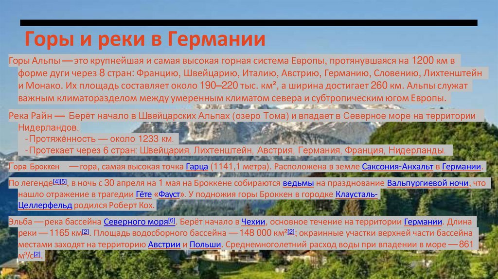 Горы и реки в ГерманииГоры Альпы — это крупнейшая и самая высокая горная система Европы, протянувшаяся на 1200 км в