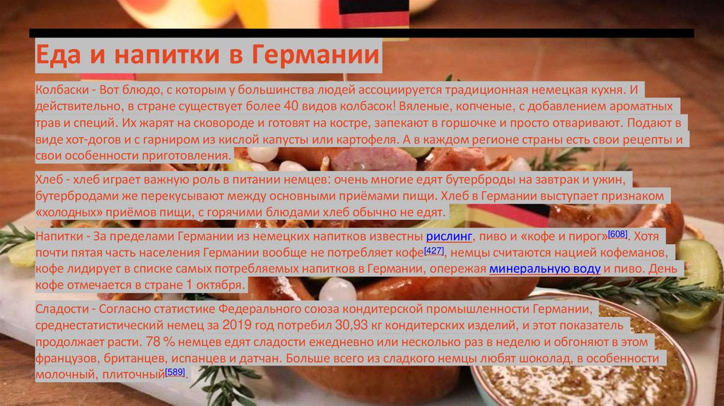 Еда и напитки в ГерманииКолбаски - Вот блюдо, с которым у большинства людей ассоциируется традиционная немецкая кухня. И