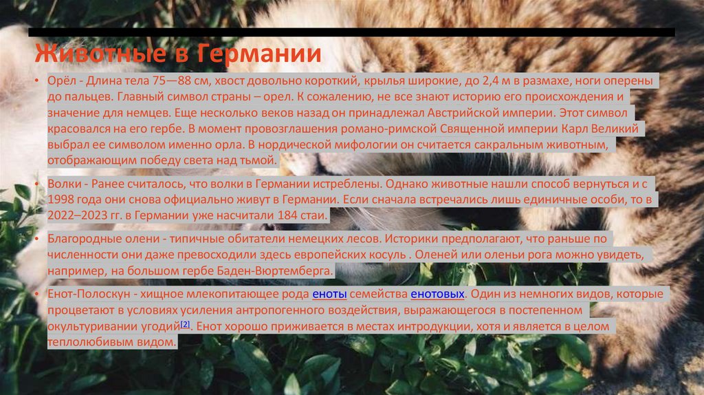 Животные в Германии• Орёл - Длина тела 75—88 см, хвост довольно короткий, крылья широкие, до 2,4 м в размахе, ноги оперены