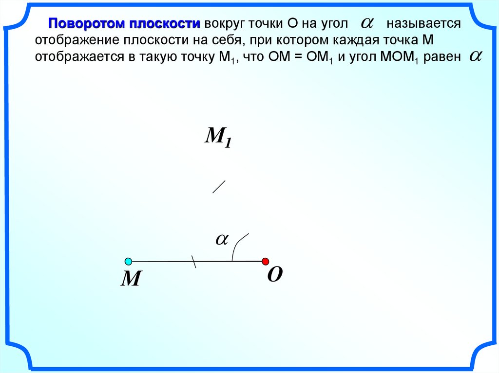Поворотом плоскости вокруг точки О на угол называетсяотображение плоскости на себя, при котором каждая точка М