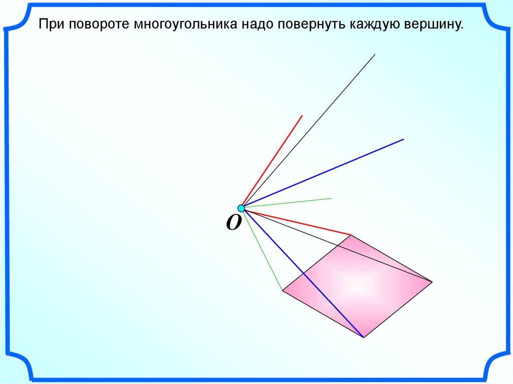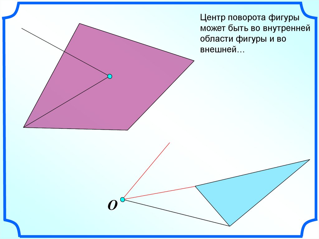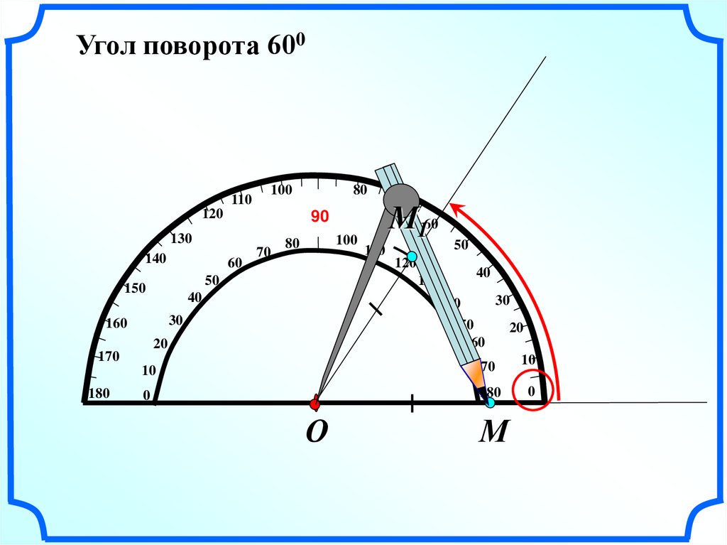 отображается в такую точку М1, что ОМ = ОМ1 и угол МОМ1 равен