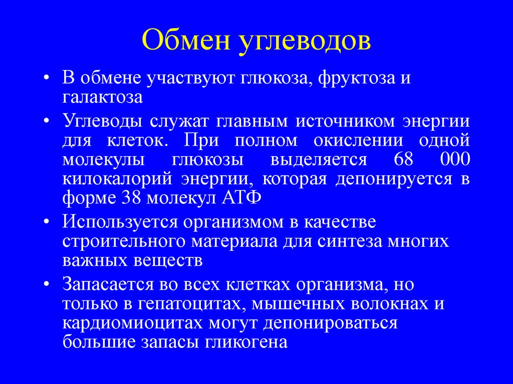 • В обмене участвуют глюкоза, фруктоза игалактоза