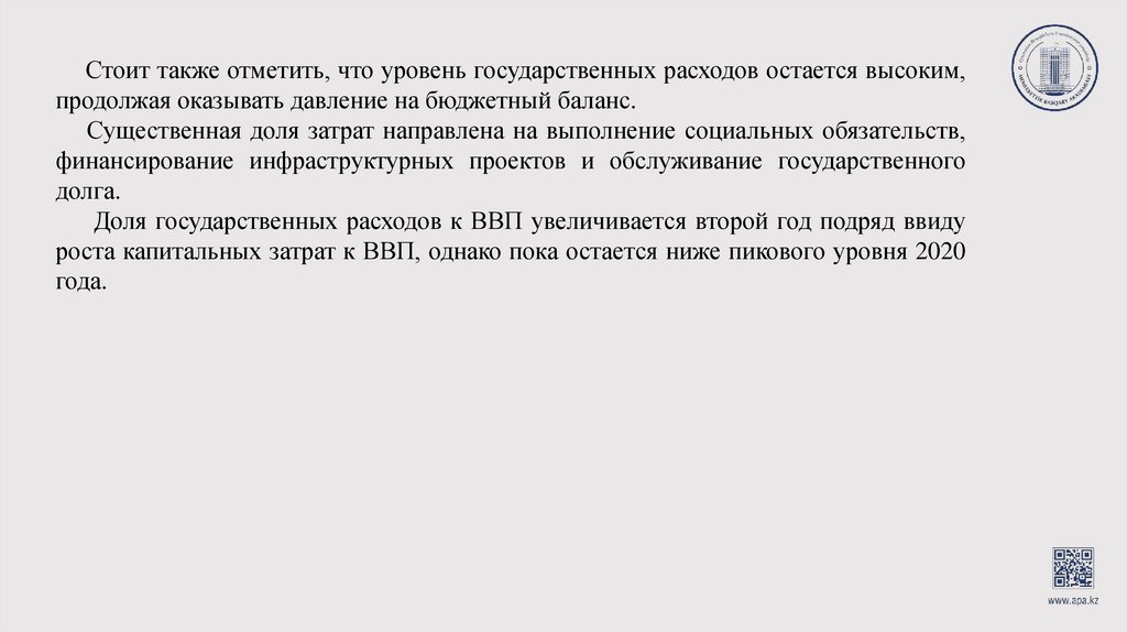 Стоит также отметить, что уровень государственных расходов остается высоким,продолжая оказывать давление на бюджетный баланс.