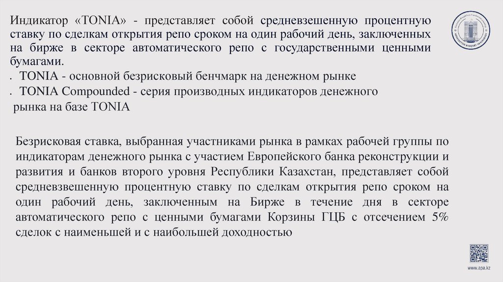 Индикатор «TONIA» - представляет собой средневзешенную процентнуюставку по сделкам открытия репо сроком на один рабочий день, заключенных