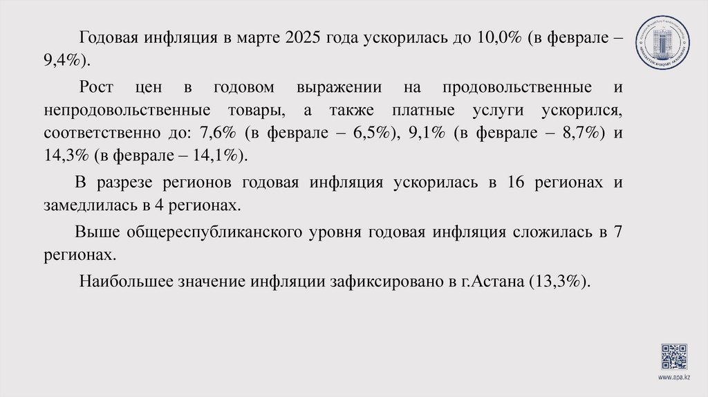 Годовая инфляция в марте 2025 года ускорилась до 10,0% (в феврале –9,4%).