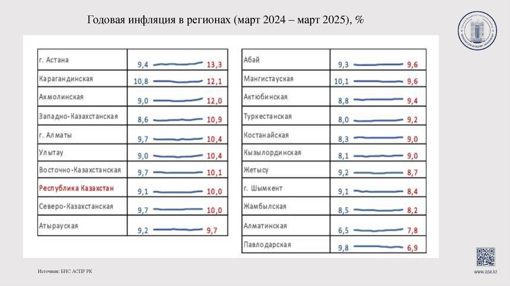 Годовая инфляция в регионах (март 2024 – март 2025), %Источник: БНС АСПР РК