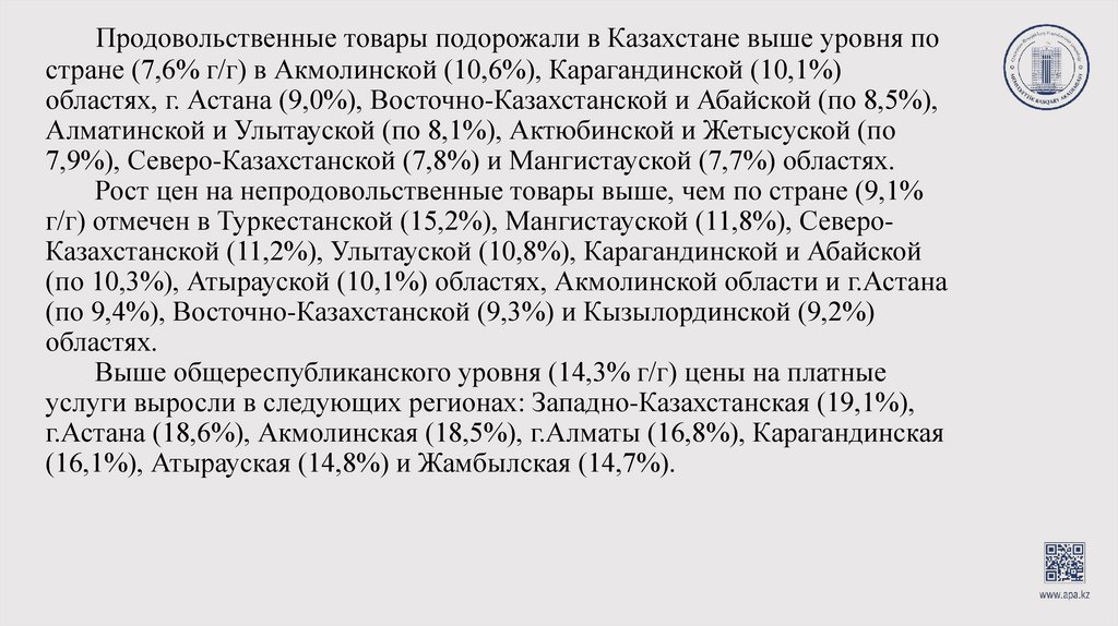 19. Продовольственные товары подорожали в Казахстане выше уровня по стране (7,6% г/г) в Акмолинской (10,6%), Карагандинской (10,1%)