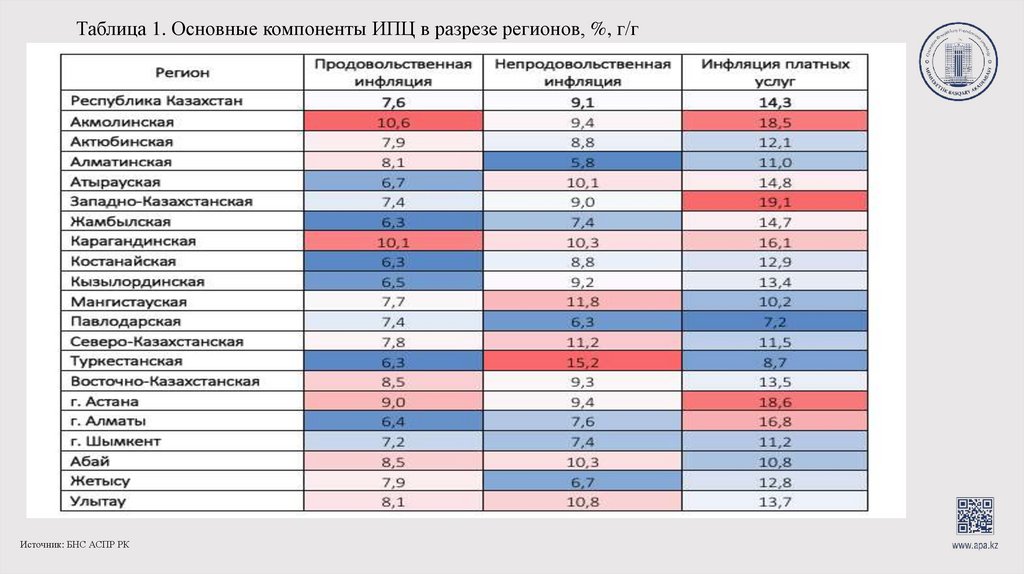 Таблица 1. Основные компоненты ИПЦ в разрезе регионов, %, г/гИсточник: БНС АСПР РК