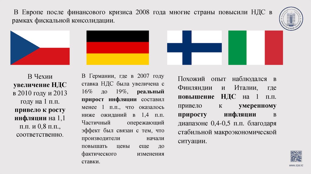 В Европе после финансового кризиса 2008 года многие страны повысили НДС врамках фискальной консолидации.