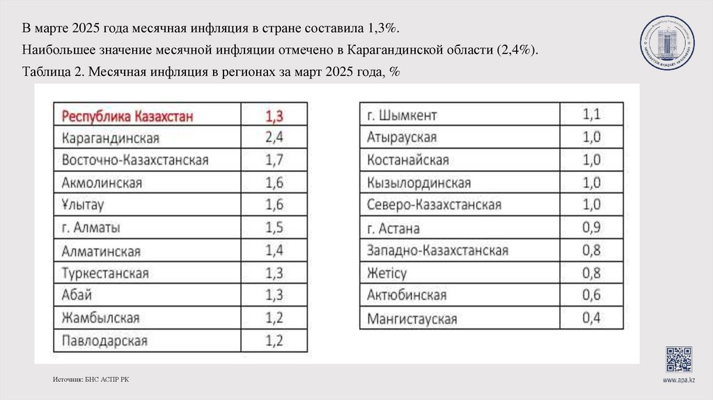 В марте 2025 года месячная инфляция в стране составила 1,3%.Наибольшее значение месячной инфляции отмечено в Карагандинской области (2,4%).