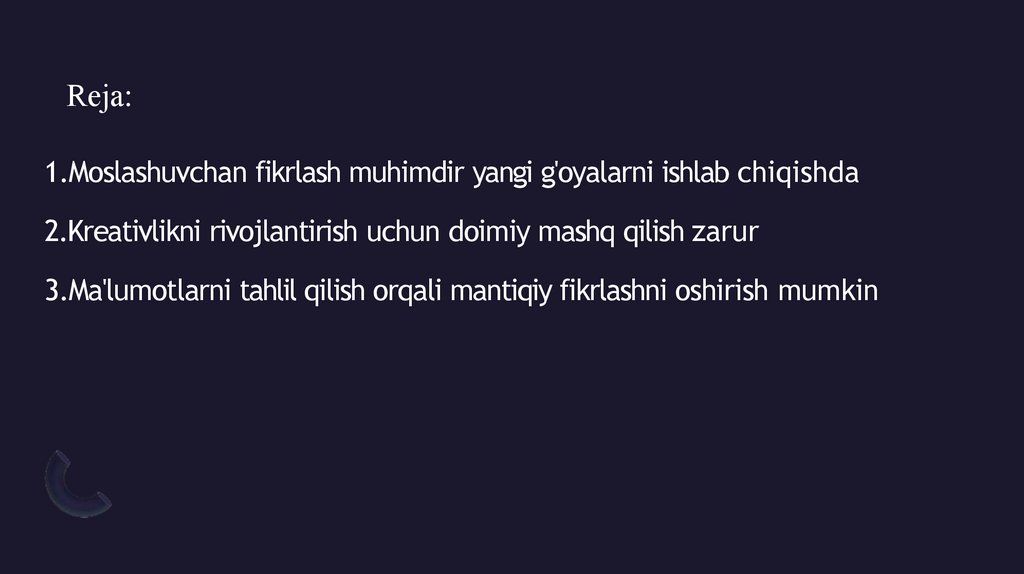 Reja:1.Moslashuvchan fikrlash muhimdir yangi g'oyalarni ishlab chiqishda
