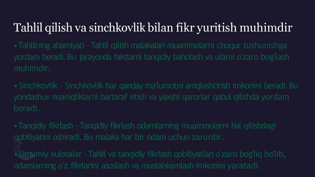 Tahlil qilish va sinchkovlik bilan fikr yuritish muhimdir• Tahlilning ahamiyati - Tahlil qilish malakalari muammolarni chuqur tushunishga
