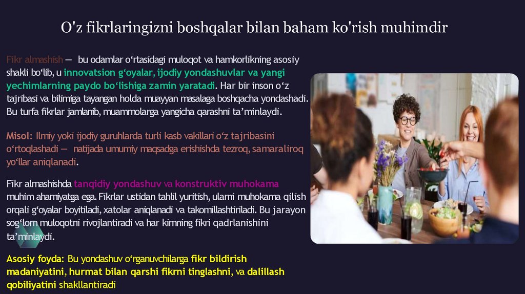 O'z fikrlaringizni boshqalar bilan baham ko'rish muhimdirFikr almashish — bu odamlar o‘rtasidagi muloqot va hamkorlikning asosiy