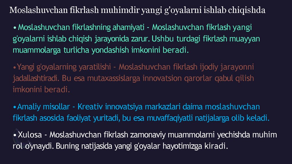 • Xulosa - Moslashuvchan fikrlash zamonaviy muammolarni yechishda muhim
