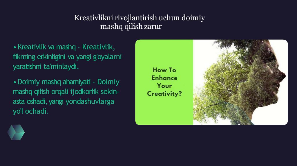 2.Kreativlikni rivojlantirish uchun doimiy mashq qilish zarur