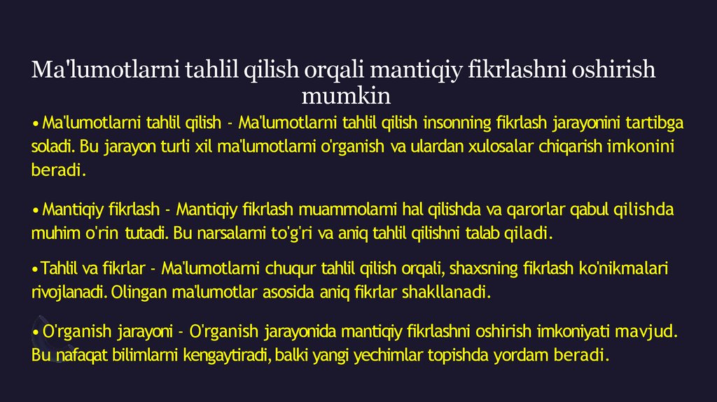 3.Ma'lumotlarni tahlil qilish orqali mantiqiy fikrlashni oshirish mumkin