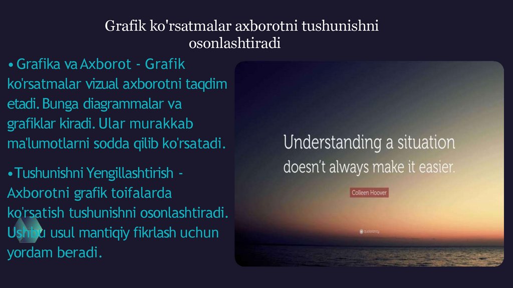 • Tushunishni Yengillashtirish Axborotni grafik toifalarda