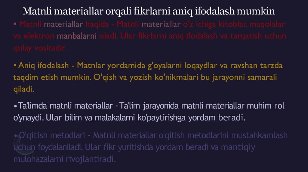 Matnli materiallar orqali fikrlarni aniq ifodalash mumkin• Ta'limda matnli materiallar - Ta'lim jarayonida matnli materiallar muhim rol