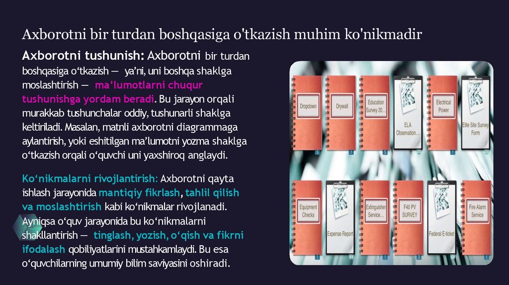 Axborotni bir turdan boshqasiga o'tkazish muhim ko'nikmadirAxborotni tushunish: Axborotni bir turdan