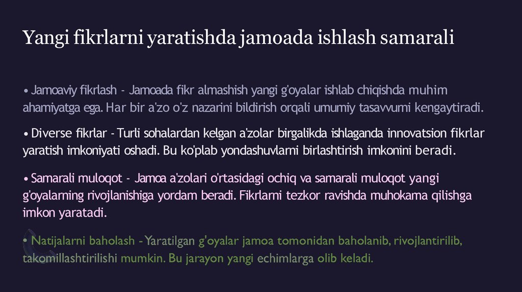 Yangi fikrlarni yaratishda jamoada ishlash samarali• Jamoaviy fikrlash - Jamoada fikr almashish yangi g'oyalar ishlab chiqishda muhim