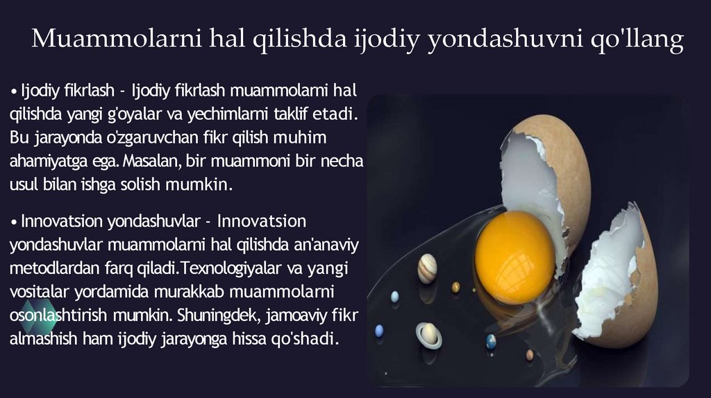 Muammolarni hal qilishda ijodiy yondashuvni qo'llang• Ijodiy fikrlash - Ijodiy fikrlash muammolarni hal