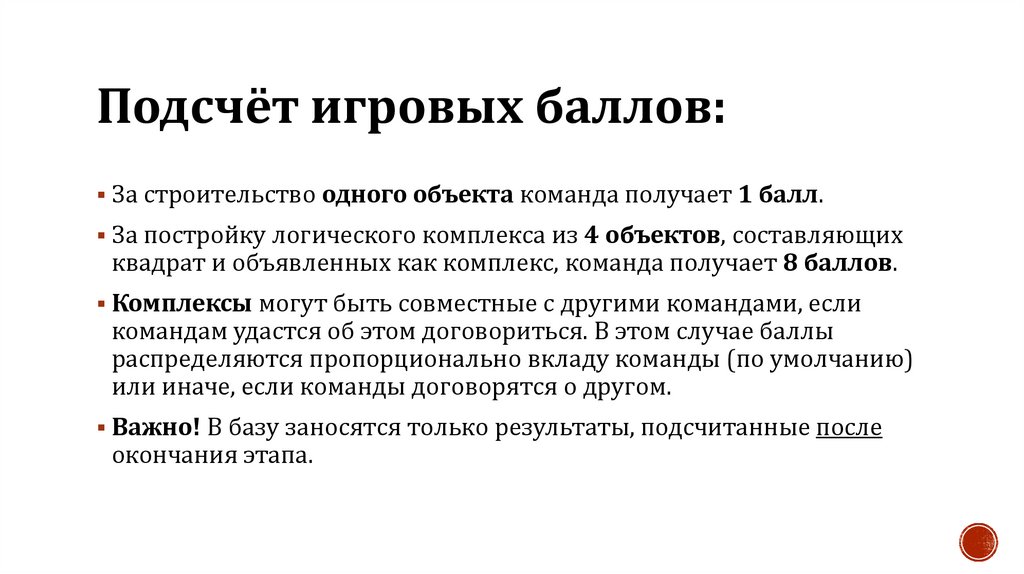За строительство одного объекта команда получает 1 балл.За постройку логического комплекса из 4 объектов, составляющих