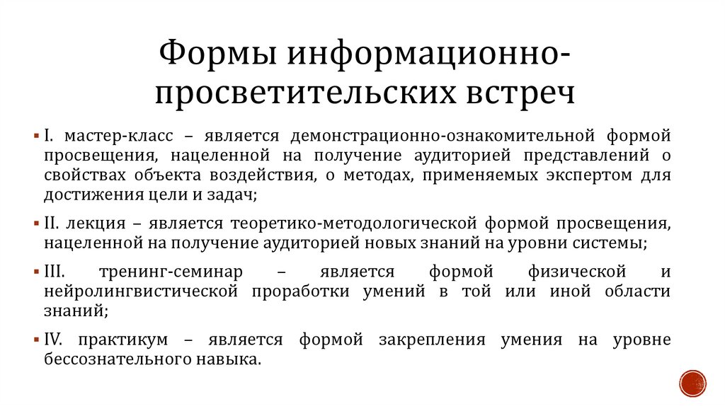 Формы информационнопросветительских встречI. мастер-класс – является демонстрационно-ознакомительной формой