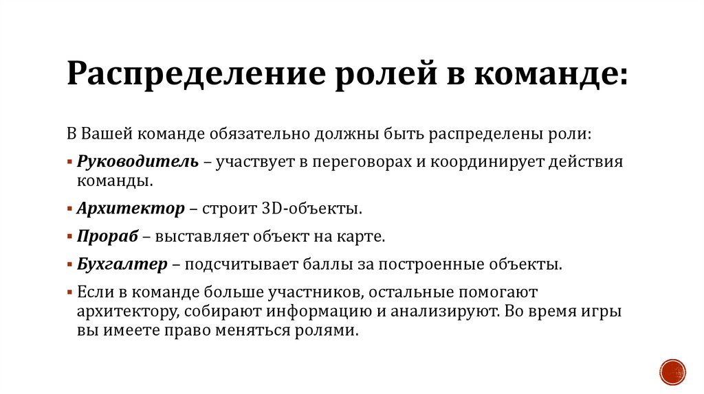 В Вашей команде обязательно должны быть распределены роли:Руководитель – участвует в переговорах и координирует действия