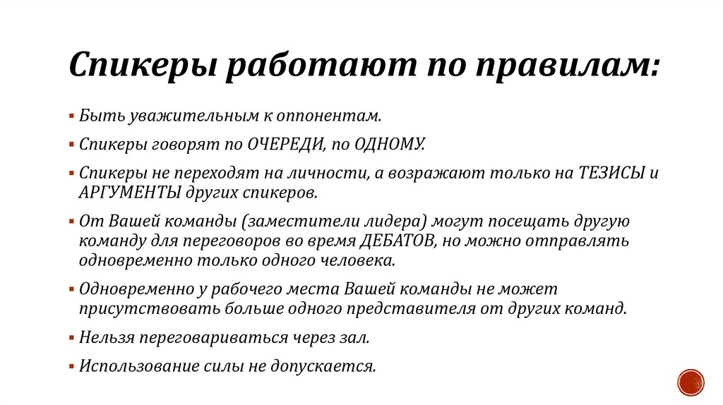 Быть уважительным к оппонентам.Спикеры говорят по ОЧЕРЕДИ, по ОДНОМУ.