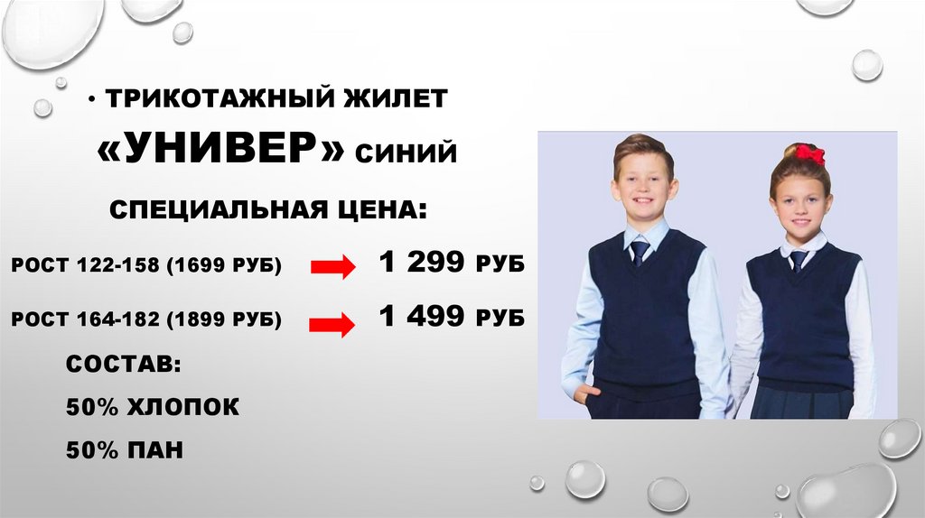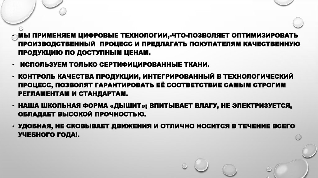 • НАША ШКОЛЬНАЯ ФОРМА «ДЫШИТ»; ВПИТЫВАЕТ ВЛАГУ, НЕ ЭЛЕКТРИЗУЕТСЯ,
