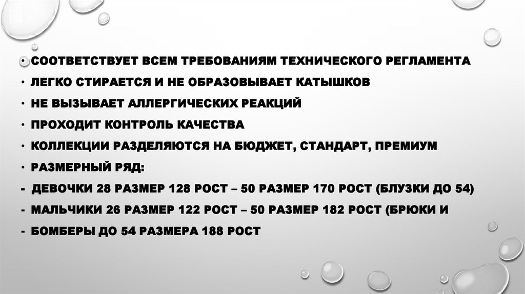 • СООТВЕТСТВУЕТ ВСЕМ ТРЕБОВАНИЯМ ТЕХНИЧЕСКОГО РЕГЛАМЕНТА• ЛЕГКО СТИРАЕТСЯ И НЕ ОБРАЗОВЫВАЕТ КАТЫШКОВ