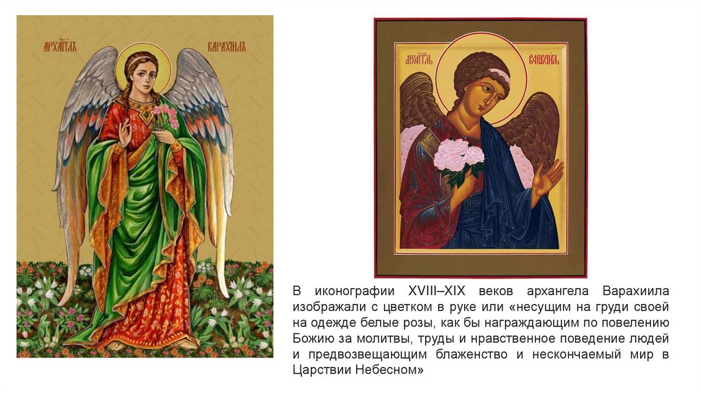 В иконографии XVIII–XIX веков архангела Варахиилаизображали с цветком в руке или «несущим на груди своей