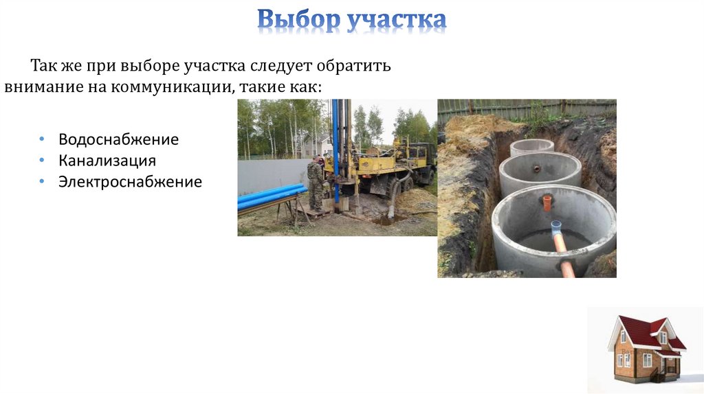 Так же при выборе участка следует обратитьвнимание на коммуникации, такие как: