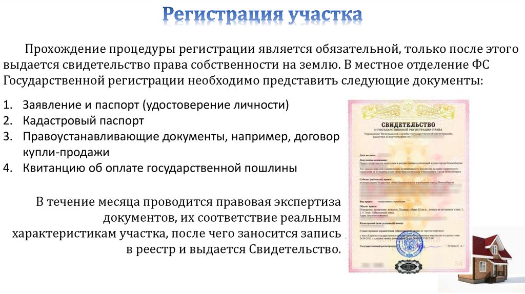 Прохождение процедуры регистрации является обязательной, только после этоговыдается свидетельство права собственности на землю. В местное отделение ФС