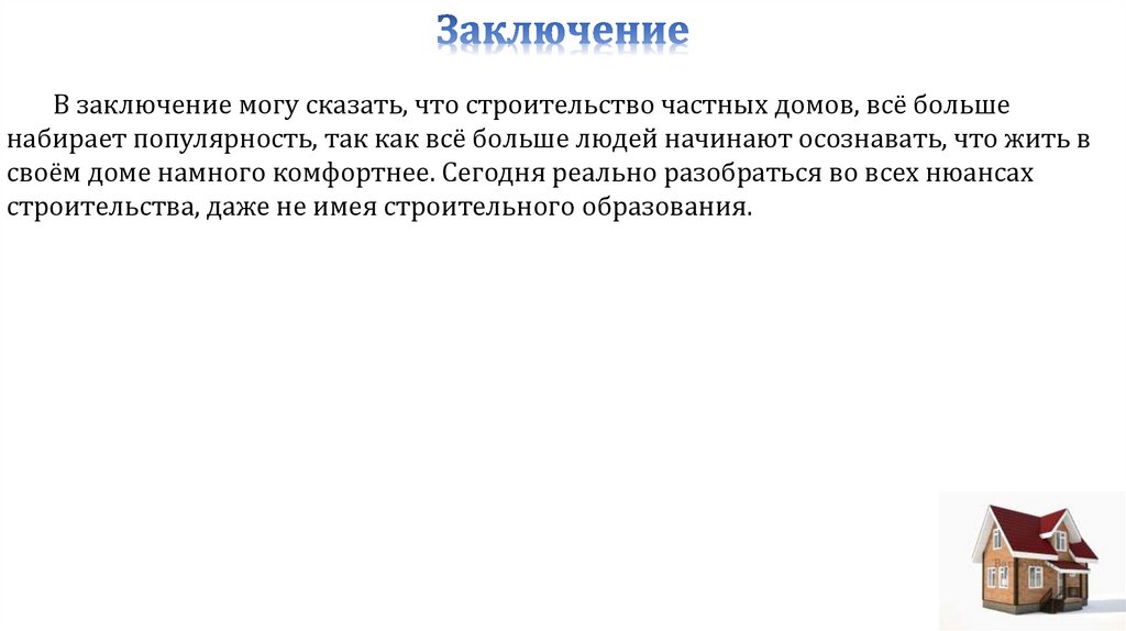 В заключение могу сказать, что строительство частных домов, всё большенабирает популярность, так как всё больше людей начинают осознавать, что жить в