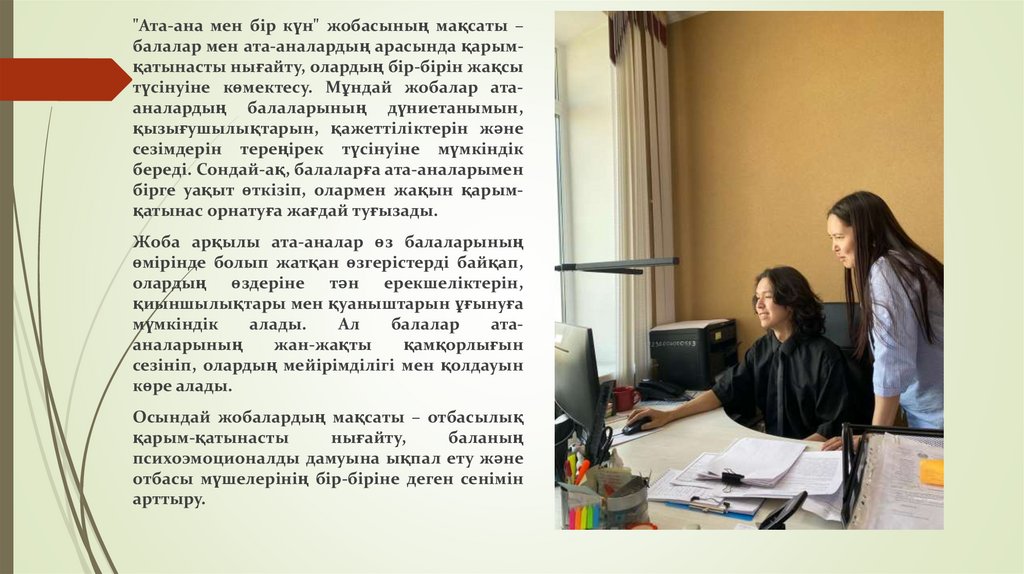 "Ата-ана мен бір күн" жобасының мақсаты –балалар мен ата-аналардың арасында қарымқатынасты нығайту, олардың бір-бірін жақсы