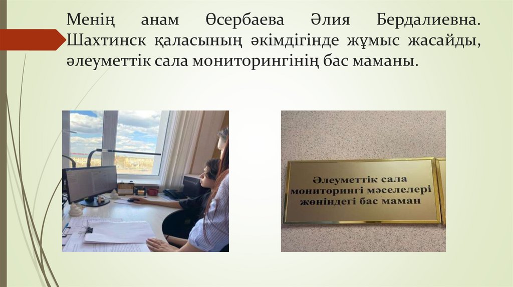 3. Менің анам Өсербаева Әлия Бердалиевна. Шахтинск қаласының әкімдігінде жұмыс жасайды, әлеуметтік сала мониторингінің бас маманы.