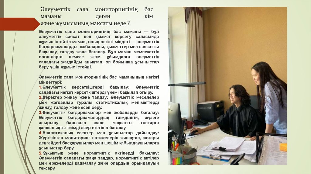 4. Әлеуметтік сала мониторингінің бас маманы деген кім және жұмысының мақсаты неде ?