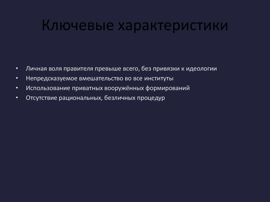 Ключевые характеристикиЛичная воля правителя превыше всего, без привязки к идеологии