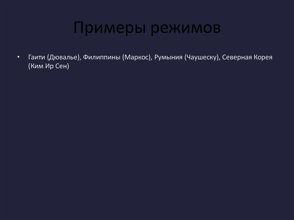 Примеры режимовГаити (Дювалье), Филиппины (Маркос), Румыния (Чаушеску), Северная Корея