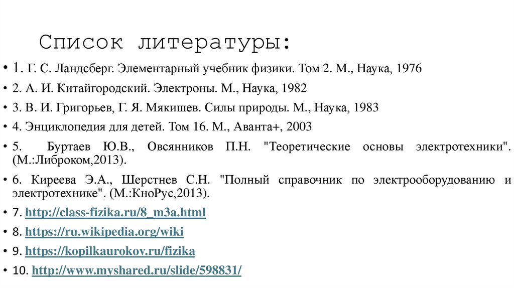 • 1. Г. С. Ландсберг. Элементарный учебник физики. Том 2. М., Наука, 1976• 2. А. И. Китайгородский. Электроны. М., Наука, 1982