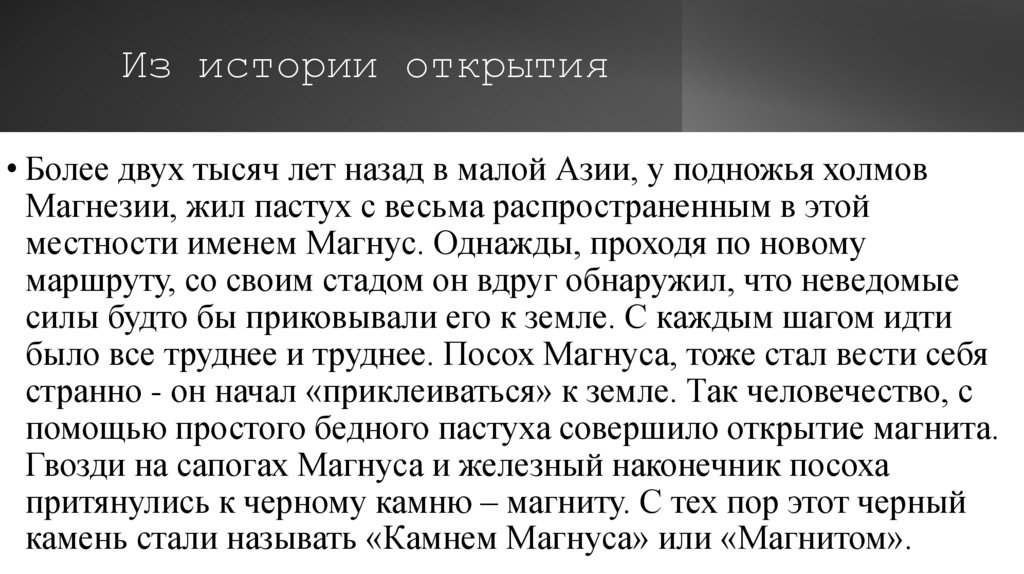 • Более двух тысяч лет назад в малой Азии, у подножья холмовМагнезии, жил пастух с весьма распространенным в этой