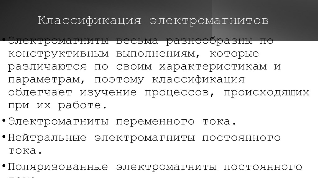 • Электромагниты весьма разнообразны поконструктивным выполнениям, которые