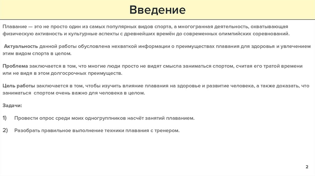 Актуальность данной работы обусловлена нехваткой информации о преимуществах плавания для здоровья и увлечением