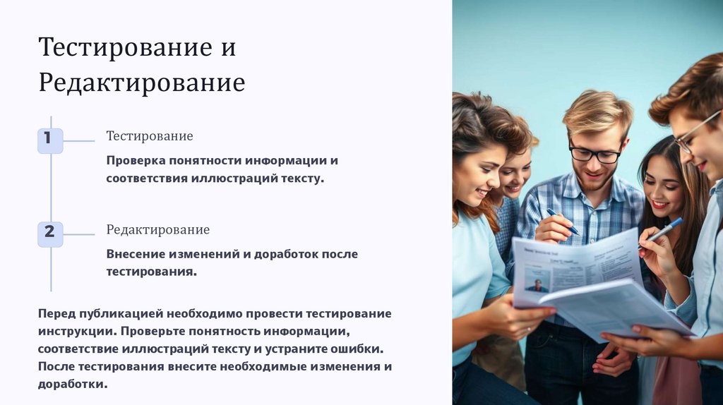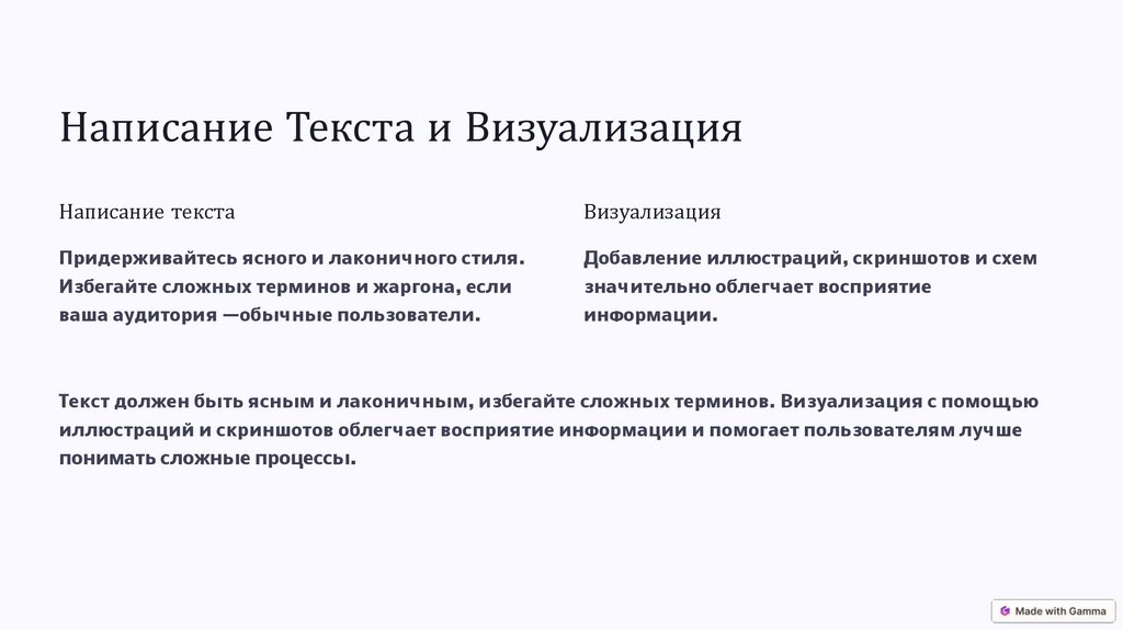 Текст должен быть ясным и лаконичным, избегайте сложных терминов. Визуализация с помощью